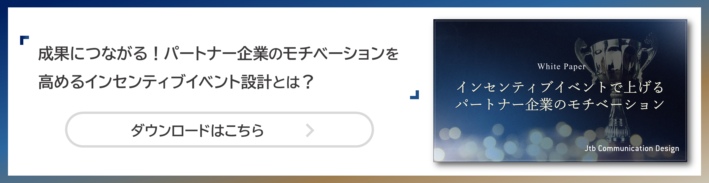 本記事では、私たちJTBコミュニケーションデザイン(以下、JCD)がこれまで手掛けてきた様々なインセンティブイベントの知見をもとに、パートナー企業のモチベーションを高める、効果的なイベント設計のポイントをご紹介します。