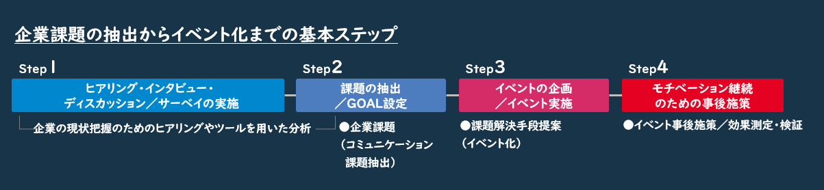 イベントプロデューサーの経験に基づいたヒアリングにより企業の課題を抽出し、イベントを実施する目的や課題を適切に把握することで、イベント当日および事前・事後施策を通じて課題解決につながるような最適な企業イベントを目指してご提案をしております。パートナー企業向けインセンティブイベント設計においても、主催者へのヒアリングはもちろんのこと、これまでの経験を通じて得た「受賞パートナー企業」や「非受賞パートナー企業」の参加者からの情報も活用していきます。